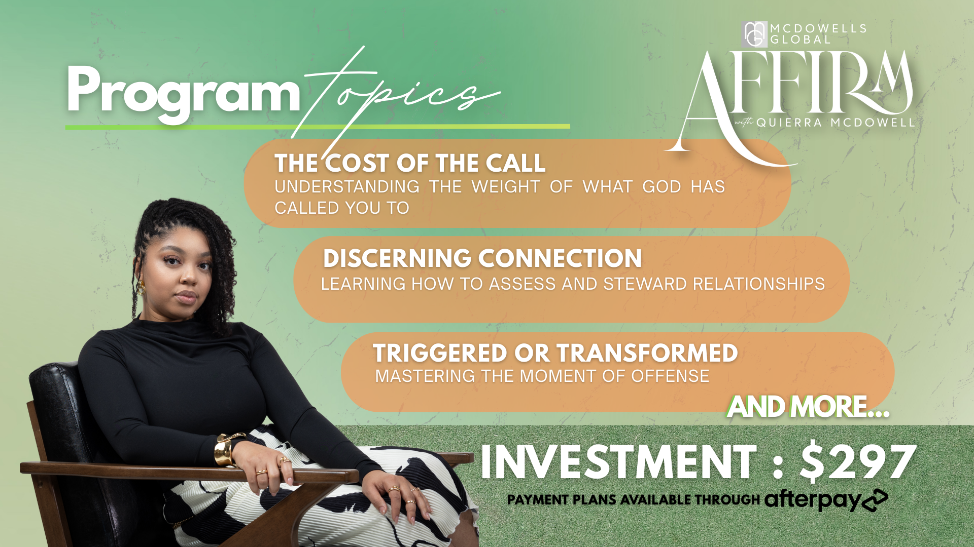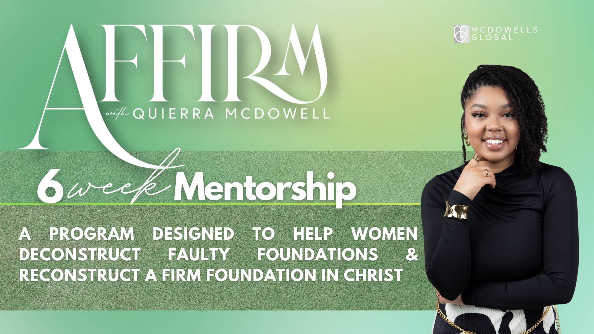 Join Quierra McDowell for a 6 week journey - designed to help women identify every area of their lives where they have built upon anything outside of Christ. This journey will help truly confront the roadblocks and seeds that bear poor fruit in our lives. This is a place of impartation and not just information. Women will leave free, healed, whole, and delivered from cycles that have kept them bound for far too long. Prepare to be Affirmed.